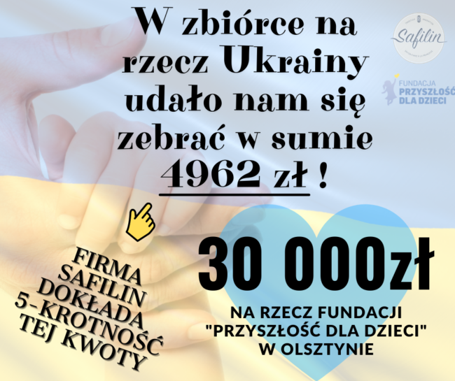 Wspólnymi siłami udało nam się przekazać kwotę w wysokości 30 000 zł dla Fundacja „Przyszłość dla Dzieci” Cieszymy się, że możemy mieć swój udział w budowaniu dzieciom lepszego, bezpiecznego życia w Olsztynie! „Te dzieci opuściły swoje miasta w huku bomb, teraz chciałyby tylko spokoju…”